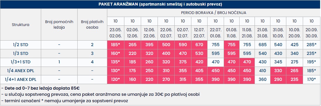 •Datum iz tabele se odnosi na period boravka. Polazak autobusa je dan ranije u odnosu na datum iz tabele.