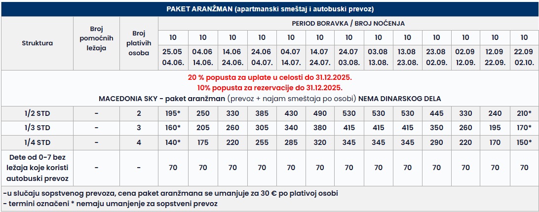 •Datum iz tabele se odnosi na period boravka. Polazak autobusa je dan ranije u odnosu na datum iz tabele.