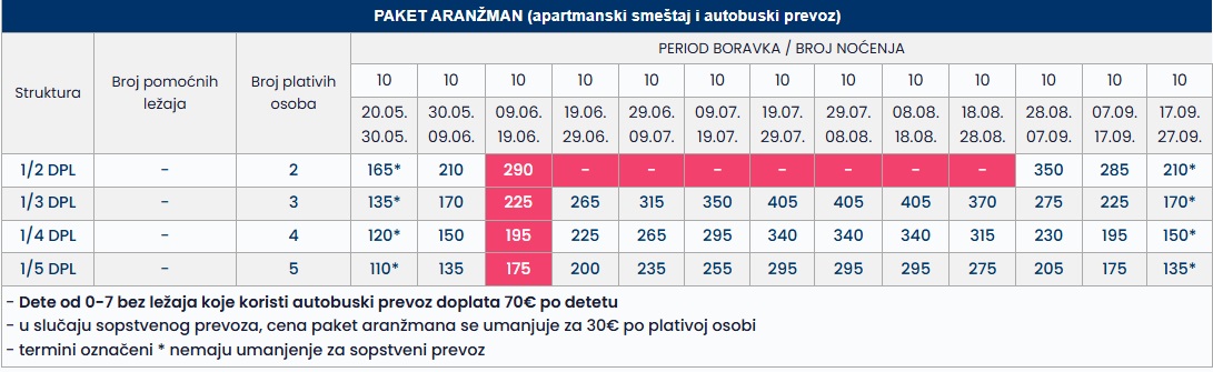 •Datum iz tabele se odnosi na period boravka. Polazak autobusa je dan ranije u odnosu na datum iz tabele.