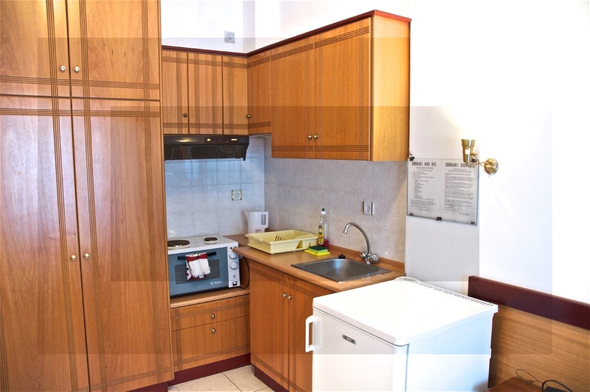 Sadržaj studija: čajna kuhinja sa posudjem i priborom, frižider, garnitura za sedenje na terasi, klima uredjaj, kupatilo sa toaletom, peškiri, terasa, tv