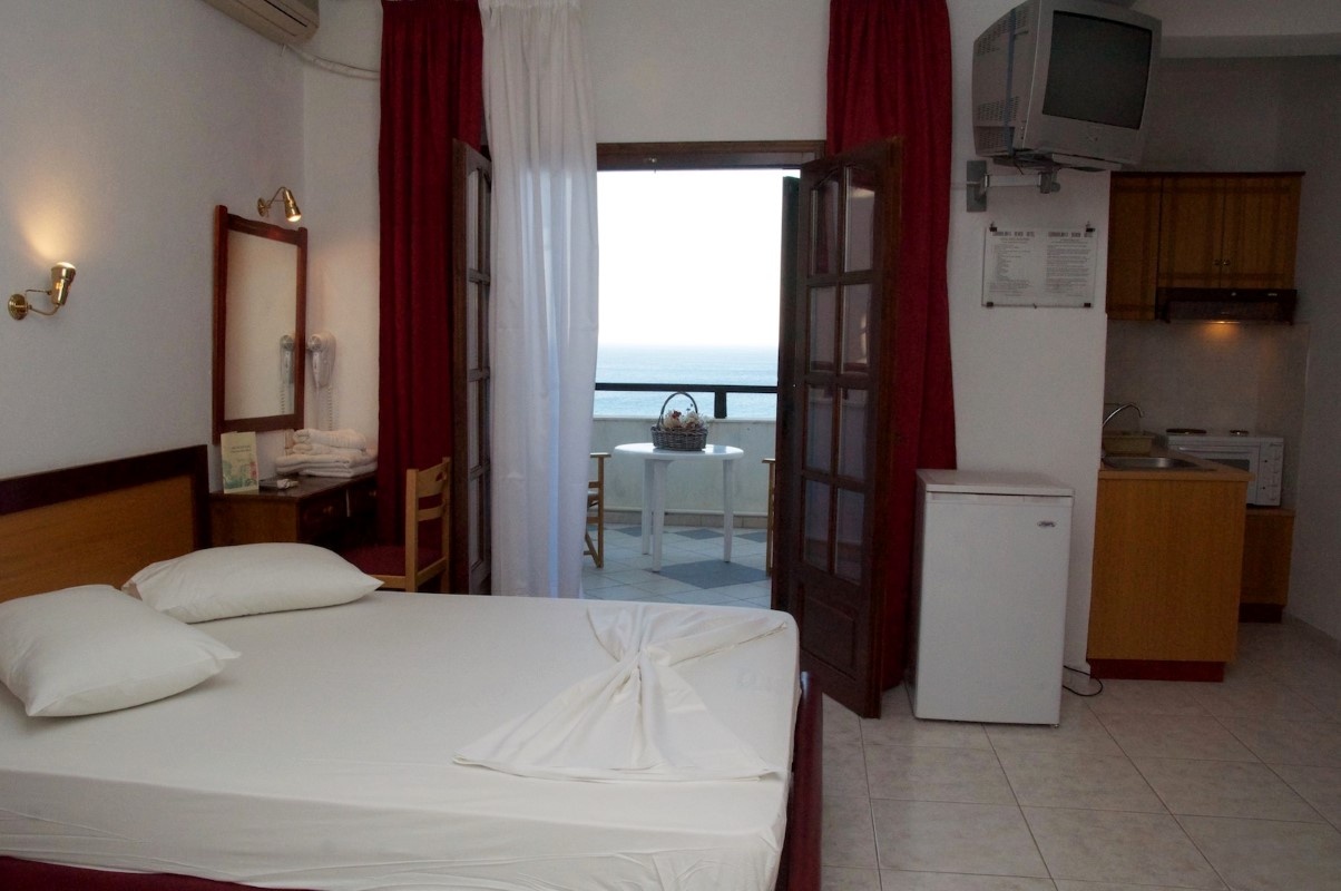 Sadržaj apartmana: čajna kuhinja sa posudjem i priborom, frižider, garnitura za sedenje na terasi, klima uredjaj, kupatilo sa toaletom, peškiri, terasa, tv