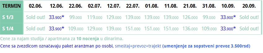 – autobuski prevoz samo za paket aranžmane (u smenama sa zvezdicom iz tabele),