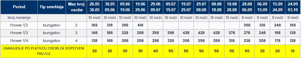 Cena u tabeli predstavlja paket aranžman (smeštaj+prevoz) po osobi.