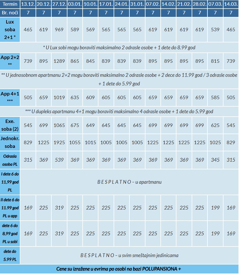 Cene u cenovniku tabela su u eurima po osobi, odnosno po smeštajnoj jedinici samo na mestima gde je to naznačeno. Prvi broj (ispred +) u tabeli cenovnika označava broj punoplativih osoba. Drugi broj (iza +) označava broj pomoćnih ležajeva. Cene su izražene u evrima, a plaćanje se vrši u dinarskoj protivvrednosti po srednjem kursu Narodne banke Srbije na dan uplate.