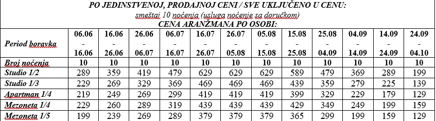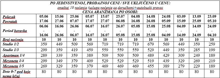 ARANŽMAN OBUHVATA za autobuski prevoz: Smeštaj u studijima/apartmanima na bazi 10 noćenja, autobuski prevoz iz Beograda, usluge predstavnika agencije i organizacije putovanja.