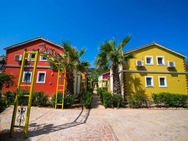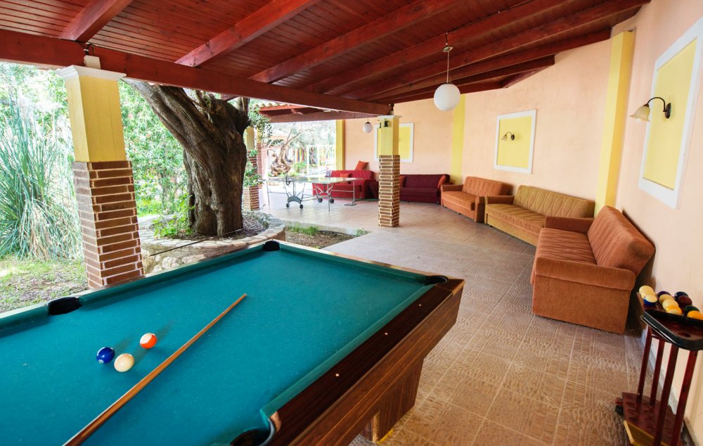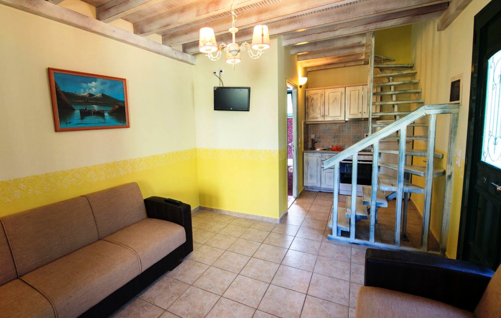 PETOKREVETNA MEZONETA: Između dva velika i dečijeg bazena na idealnoj lokaciji u kompleksu, nalazi se petokrevetna mezoneta. Velika zasebna kuća u svom sastavu ima dve mezonete koje su u potpunosti odvojene i svaka ima svoj zaseban ulaz i svoju potpunu privatnost. Ograđena je sa puno zelenila i prelepog cveća. Ulazi se u prostoriju u kojoj se nalazi dnevni boravak i kuhinja. U dnevnom boravku se nalaze dva kreveta na razvlačenje svaki dimenzija (100X180cm), ormar, TV. Kuhinja u svom sastavu poseduje šporet sa četiri ringle, frižider sa posebnom komorom za zamrzavanje, aspirator i pribor za ručavanje za pet osoba. Kupatilo se takođe nalazi na donjem nivou i poseduje malu kadu sa zavesom, kao i fen za kosu. Iz dnevnog boravka se izlazi na terasu koja je opremljena stolom sa pet stolica. Iz dnevnog boravka se stepenicama penje na gornji nivo. U otvorenom delu se nalazi jedan sing ležaj dimenzija (80X180cm), klima uređaj i prozor. Odatle se nastavlja u zasebnu spavaću sobu, koja u svom sastavu ima Francuski ležaj dimenzija (140X200cm), ormar u kome se nalazi sef, noćni stočić sa ogledalom, kao i dva mala stočića pored kreveta. Mezoneta je idealna za porodice sa više dece, kao i za omanje društvo koje želi da bude zajedno.