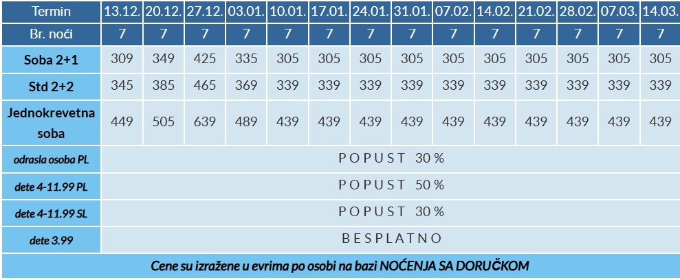 POLAZAK IZ BEOGRADA (NIŠA, NOVOG SADA) – je dan ranije u odnosu na datume iz tabele cenovnika smeštaja.
