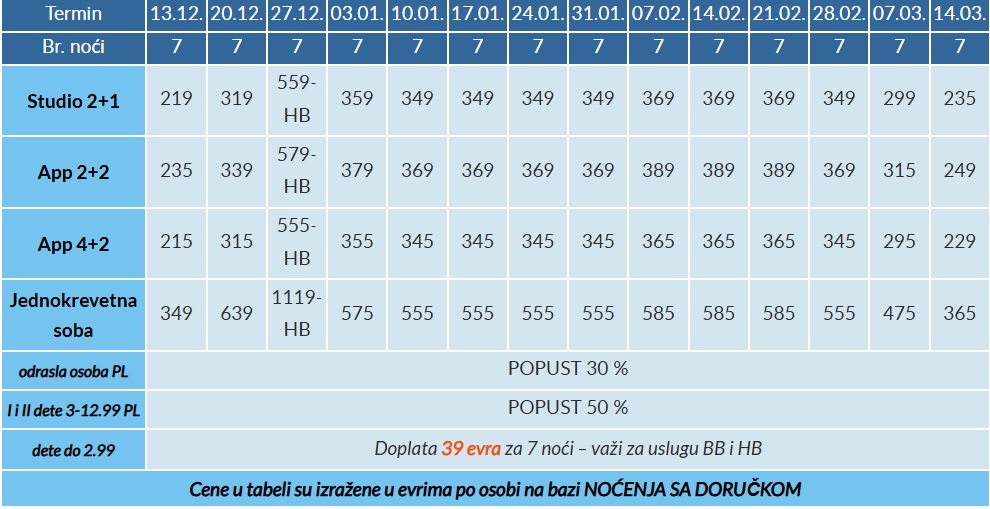 Cene u cenovniku tabela su u eurima po osobi, odnosno po smeštajnoj jedinici samo na mestima gde je to naznačeno. Prvi broj (ispred +) u tabeli cenovnika označava broj punoplativih osoba. Drugi broj (iza +) označava broj pomoćnih ležajeva. Cene su izražene u evrima, a plaćanje se vrši u dinarskoj protivvrednosti po srednjem kursu Narodne banke Srbije na dan uplate.
