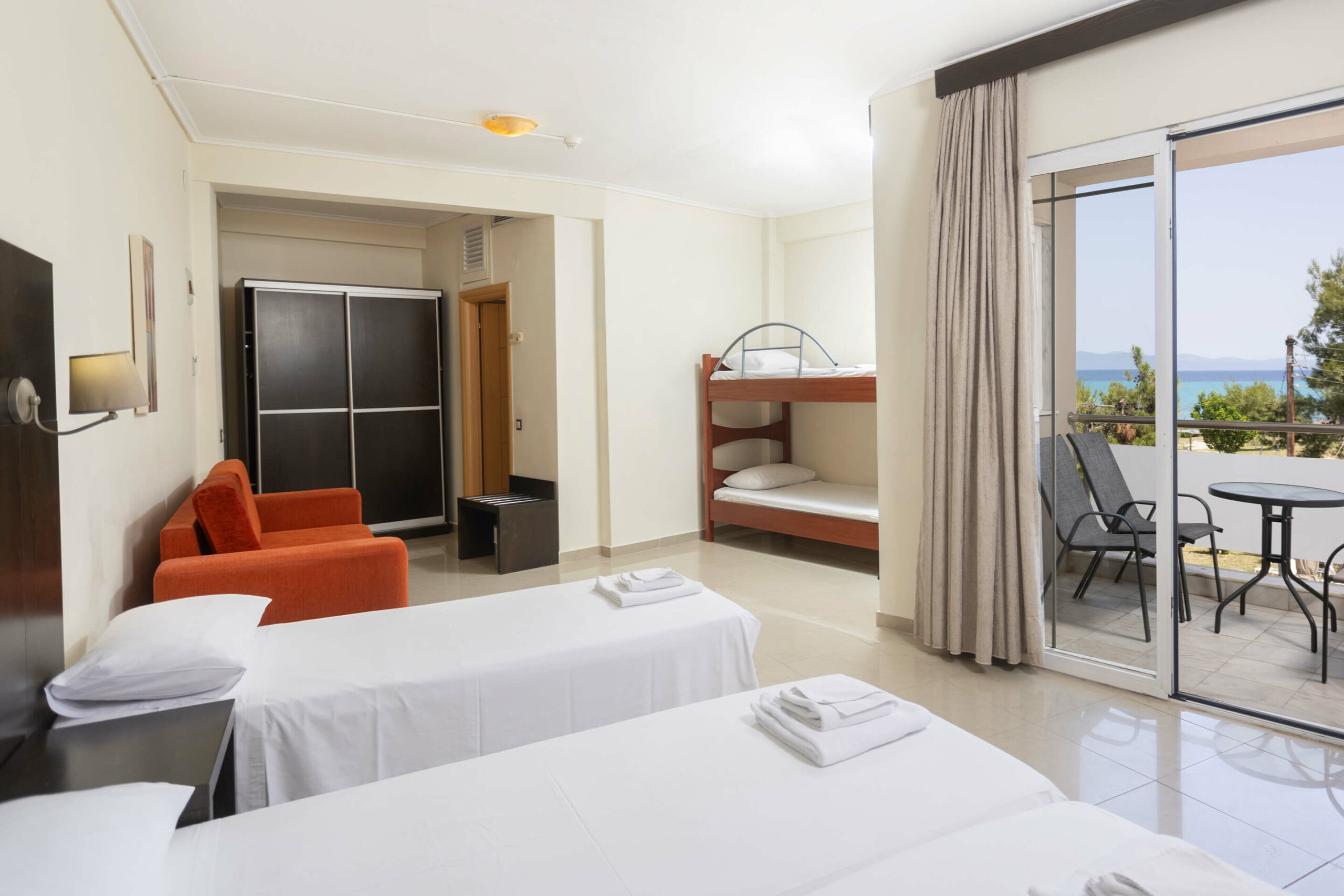 Family Room Side Sea View-Soba otvorenog tipa, površine 20-23 m2, opremljena bračnim ili dva odvojena kreveta i krevetom na na sprat za decu, sopstvenim kupatilom i nameštenim balkonom s bočnim pogledom na more.