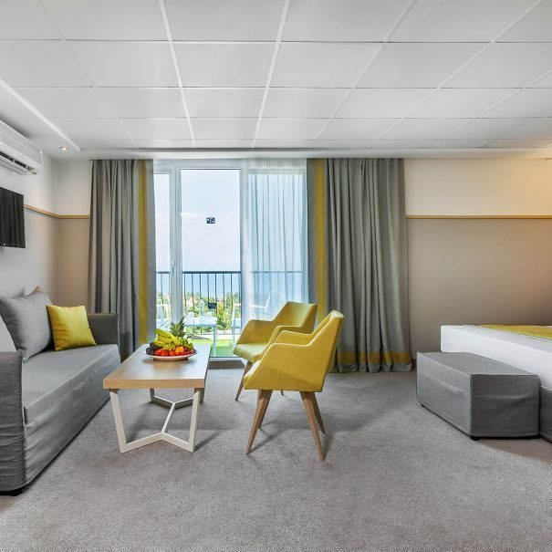 Deluxe Suite Seaview- Apartman od 45 m², s odvojenom spavaćom sobom s bračnim krevetom i dnevnim boravkom s kaučima na razvlačenje, velikim balkonom s pogledom na more i sopstvenim kupatilom s tušem