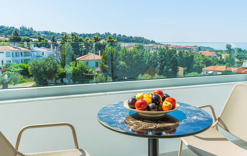 Comfort Room Sea View- Soba od 25 m² otvorenog tipa s bračnim ili dva odvojena kreveta i kaučem na razvlačenje, sopstvenim kupatilom i balkonom s pogledom na more.