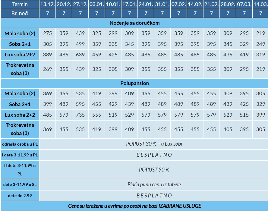 POLAZAK IZ BEOGRADA (NIŠA, NOVOG SADA) – je dan ranije u odnosu na datume iz tabele cenovnika smeštaja.