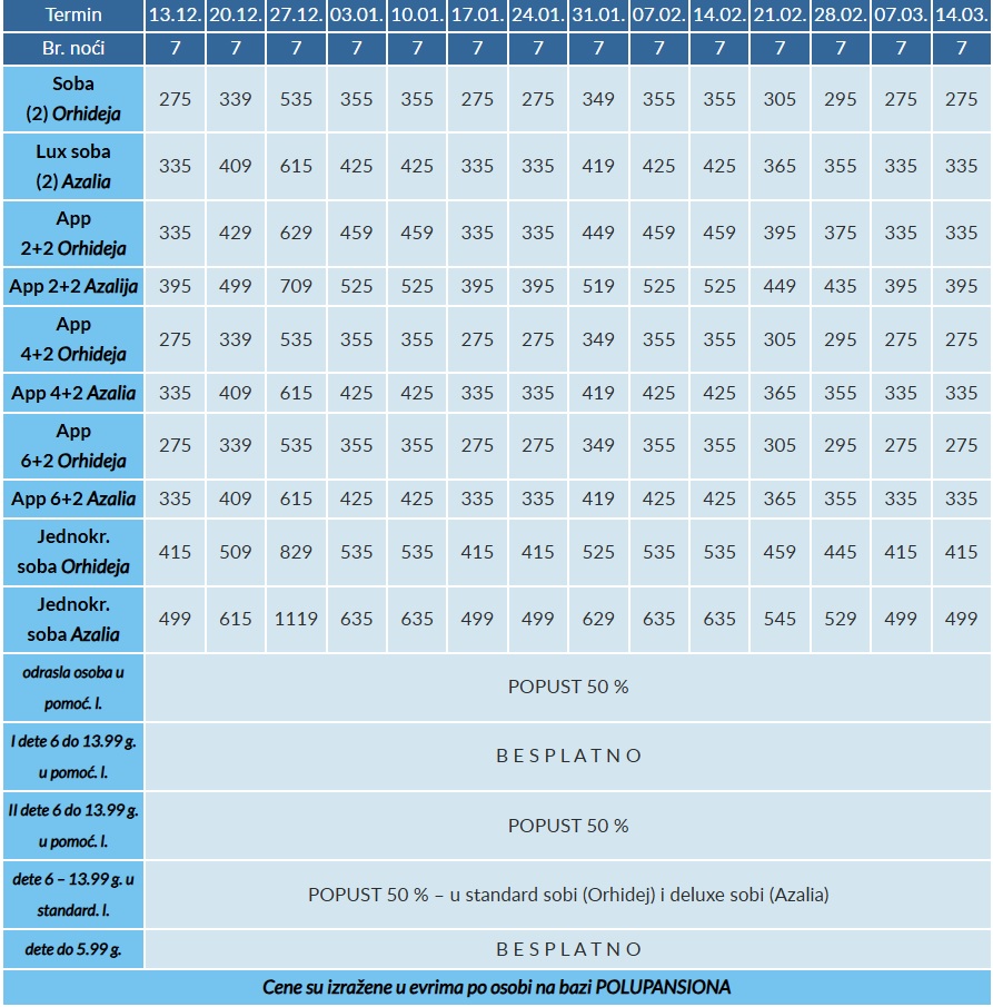 Doplata za božićnu večeru u terminu 23.12.-30.12. ( nije obavezno): odrasli 50 eur / deca 6-13,99 – 30 eur.