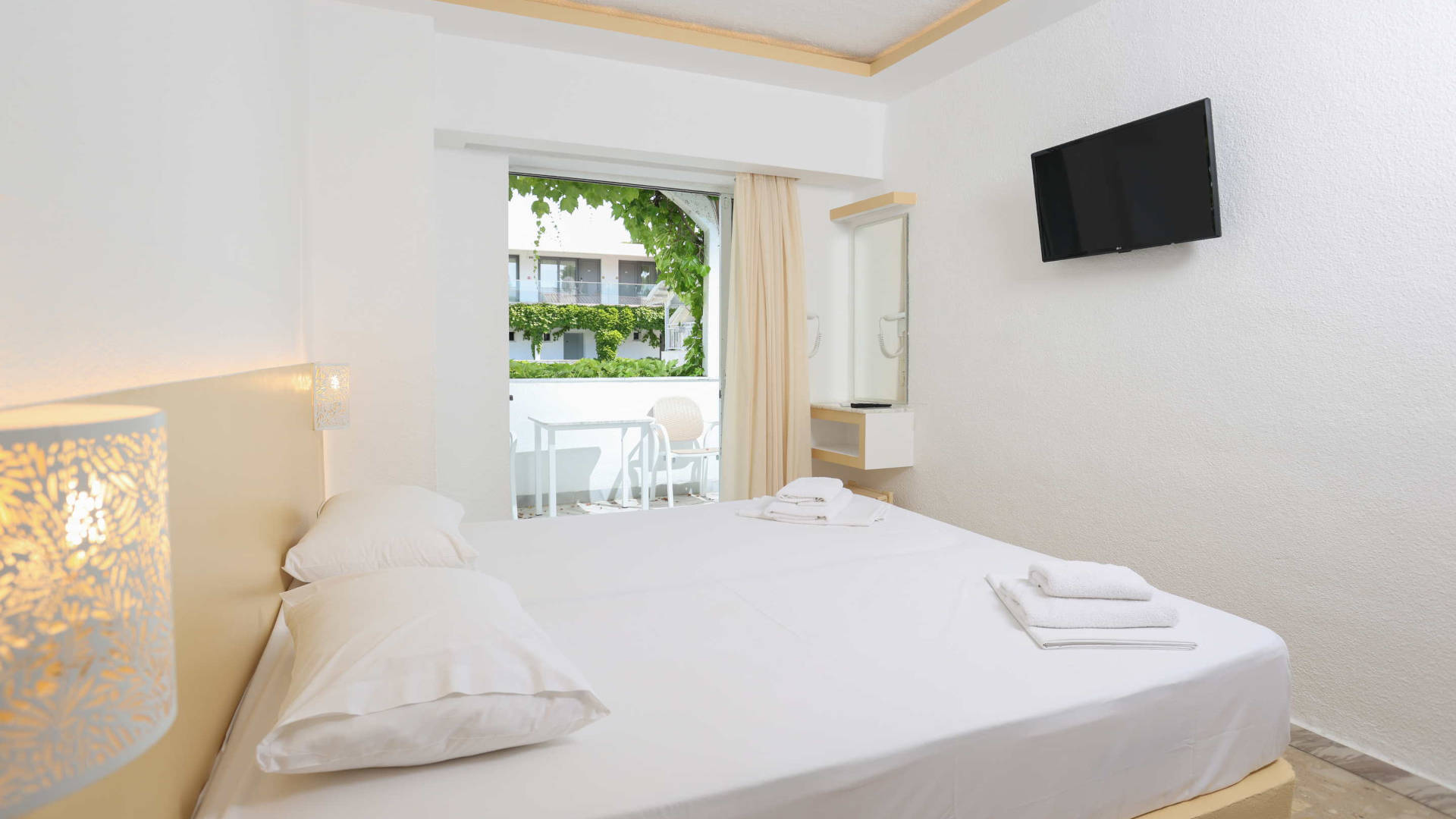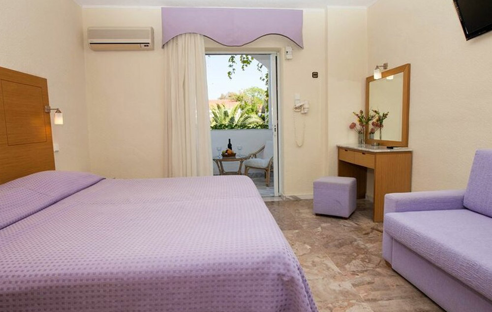 Standard Room for 3 persons-18 m2, otvorene sobe za goste sa bračnim ili dva odvojena kreveta i pomoćnim ležajem, sopstvenim kupatilom i nameštenim balkonom sa pogledom na bazen ili baštu. Nalazi se u prizemlju.