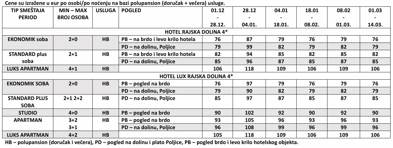Cenovnik br.1 Hotel Rajska dolina Jahorina zima 2025/26 od 10.10.2025.