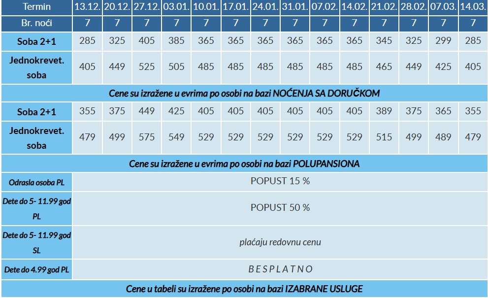 POLAZAK IZ BEOGRADA (NIŠA, NOVOG SADA) – je dan ranije u odnosu na datume iz tabele cenovnika smeštaja.