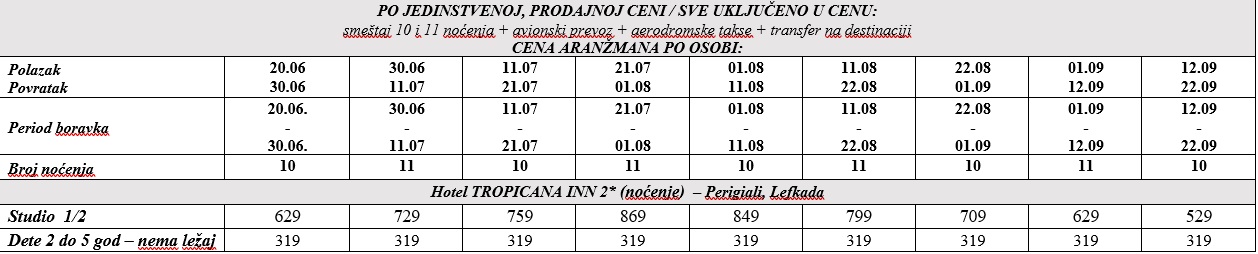 ARANŽMAN OBUHVATA za autobuski prevoz: Smeštaj u studijima/apartmanima na bazi 10 noćenja, autobuski prevoz iz Beograda, usluge predstavnika agencije i organizacije putovanja.