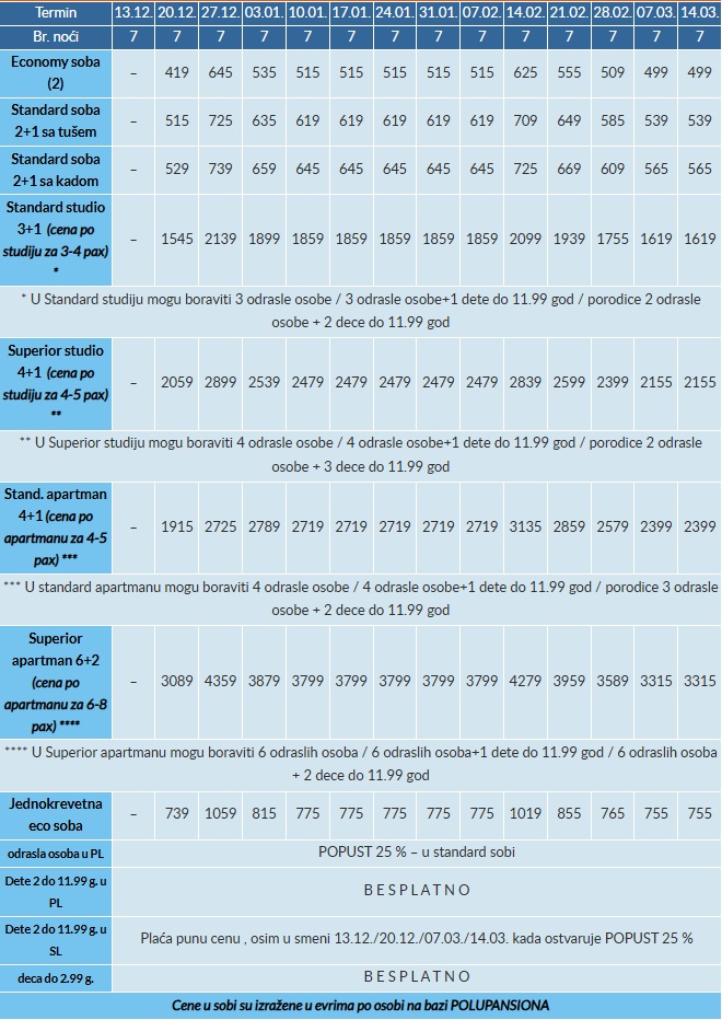 Cene u cenovniku tabela su u eurima po osobi, odnosno po smeštajnoj jedinici samo na mestima gde je to naznačeno. Prvi broj (ispred +) u tabeli cenovnika označava broj punoplativih osoba. Drugi broj (iza +) označava broj pomoćnih ležajeva.