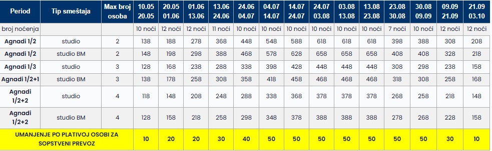 Cena u tabeli predstavlja paket aranžman (smeštaj+prevoz) po osobi.