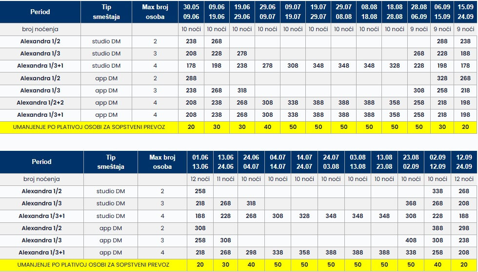 Cena u tabeli predstavlja paket aranžman (smeštaj+prevoz) po osobi.