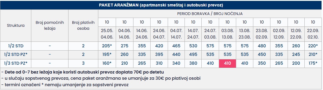 • Datum iz tabele se odnosi na period boravka. Polazak autobusa je dan ranije u odnosu na datum iz tabele.