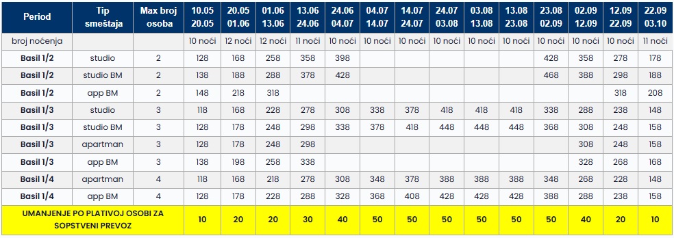 Cena u tabeli predstavlja paket aranžman (smeštaj+prevoz) po osobi.