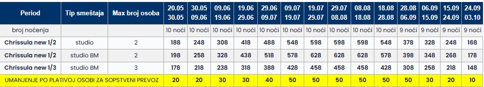 Cena u tabeli predstavlja paket aranžman (smeštaj+prevoz) po osobi.