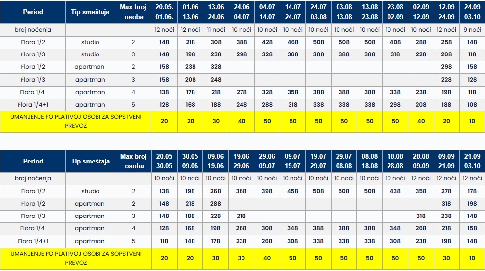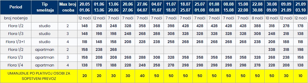 Cena u tabeli predstavlja paket aranžman (smeštaj+prevoz) po osobi.