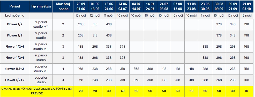 Cena u tabeli predstavlja paket aranžman (smeštaj+prevoz) po osobi.