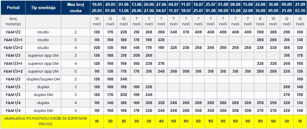 Cena u tabeli predstavlja paket aranžman (smeštaj+prevoz) po osobi.