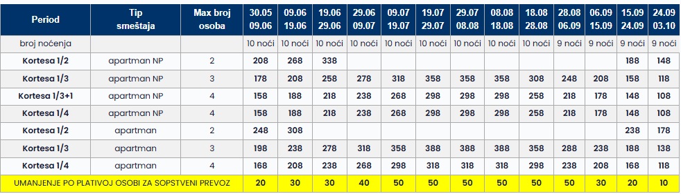 Cena u tabeli predstavlja paket aranžman (smeštaj+prevoz) po osobi.