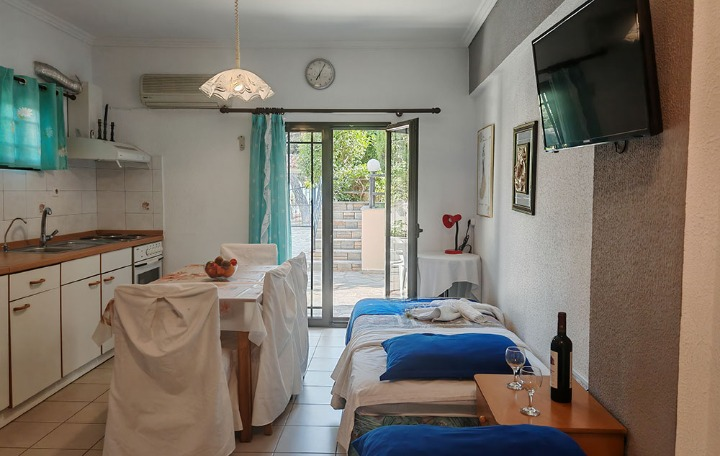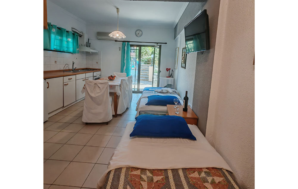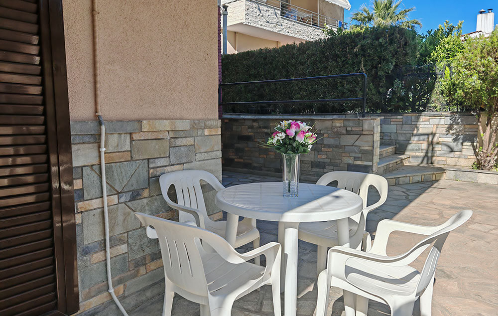 Kuća Melissa Psakudija nalazi se na 140m od peščane plaže. U ponudi su dva četvorokrevetna apartmana u prizemlju sa velikim terasama. Kuća ima signal za bežični internet, a apartmani imaju TV i klima uređaj čije je korišćenje uključeno u cenu. Kako su ovo apartmani istoimenog hotela, gosti imaju pravo na korišćenje svih sadržaja hotela Melissa Gold Coast (bazen, ležaljke pored bazena, ležaljke u beach baru i na plaži, uz obaveznu konzumaciju, kao i igraonica za decu, uz naplatu ulaza u igraonicu).