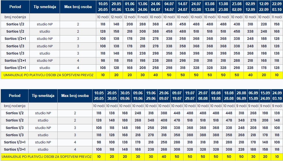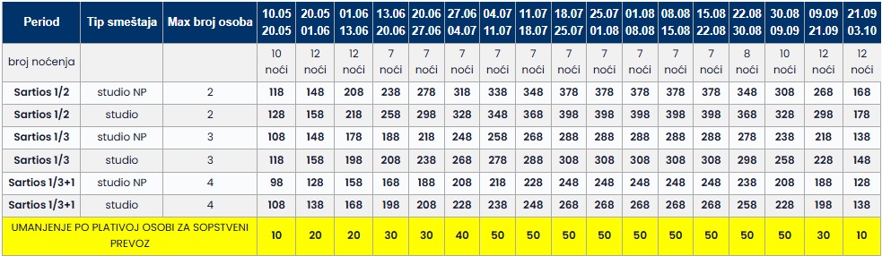 Povoljni paket aranžmani tokom cele sezone Cena paket aranžmana obeležena je zvezdicom i uključuje smeštaj u studiju ili apartmanu po izboru u trajanju od 9, 10, 11 ili 12 noći i autobuski prevoz. Na prethodnoj strani u tekstu i tabeli za autobuski prevoz navedena su sva mesta garantovanog polaska. Cena istaknuta u cenovniku se odnosi na polazak iz Beograda. Za polazak iz Novog Sada doplata je 10 eur po osobi, za polazak iz Pančeva doplata je 15 eur po osobi, a za ostala mesta 20 eur po osobi. Za polazak iz Subotice, Sombora, Bačke Topole i Sente u julu i avgustu doplata je 30 eur po osobi, a u maju, junu i septembru doplata je 20 eur po osobi.