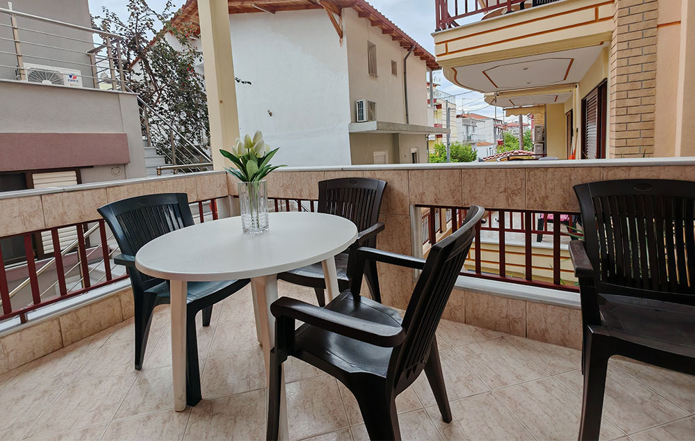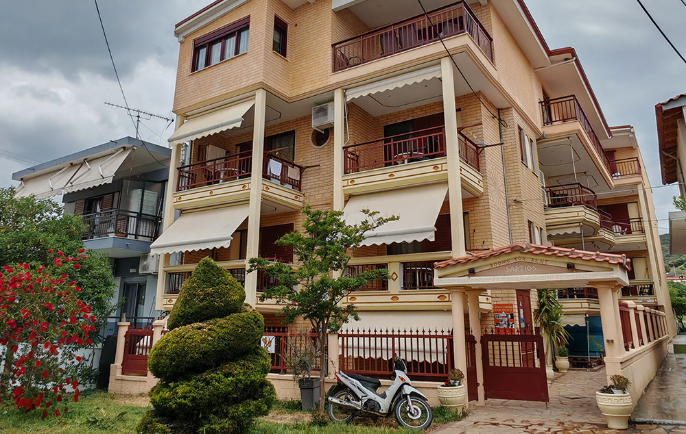 Kuća Sartios Sarti nalazi se na oko 180 metara od najlepše uređenog dela plaže u Sartiju i na 70 metara od trga. U ponudi su studiji za 2-4 osobe koji se nalaze na prvom i drugom spratu. Kuća Sartios Sarti ima SAT TV, klima uređaje čije je korišćenje uključeno u cenu u julu i avgustu i signal za besplatno korišćenje bežičnog interneta. Noviji studiji se nalaze u niskom prizemlju.