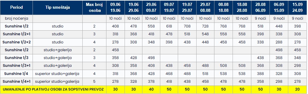Cena u tabeli predstavlja paket aranžman (smeštaj+prevoz) po osobi.