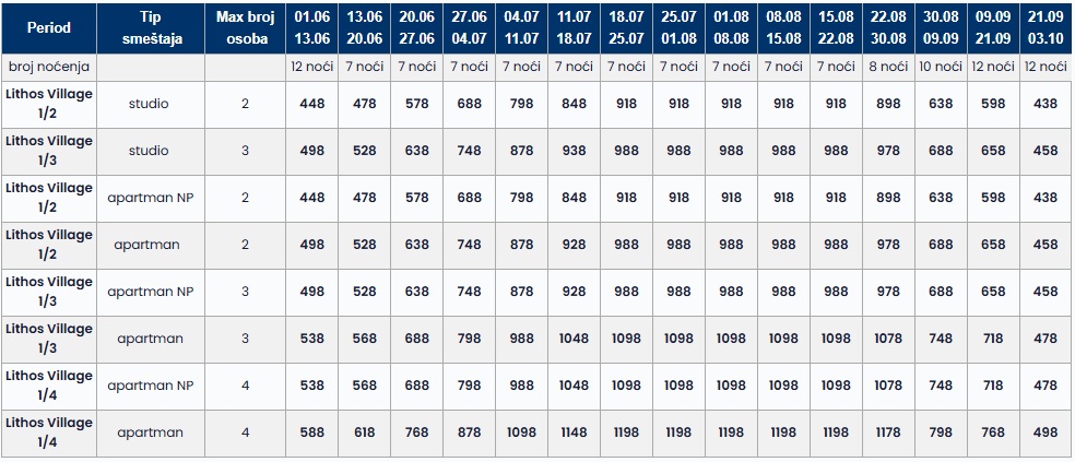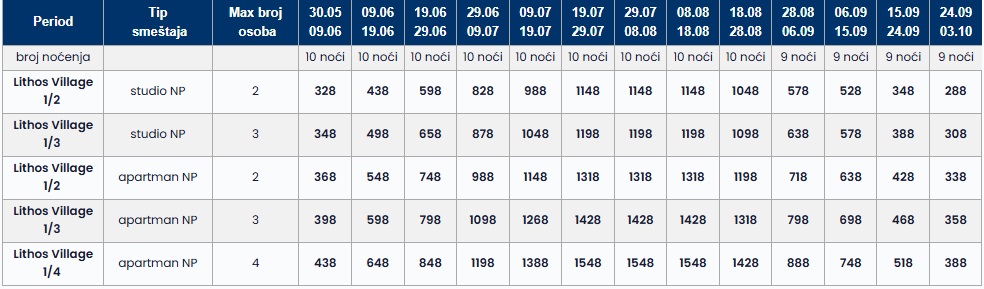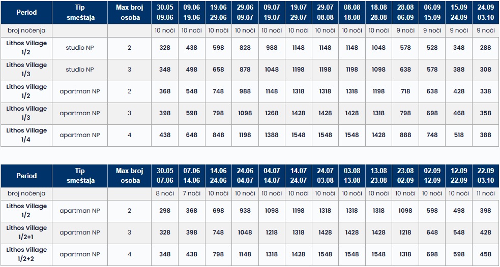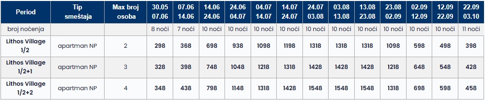 – Cene iz tabele predstavljaju ukupnu cenu najma smeštaja za navedeni broj osoba u navedenom terminu i ne postoji umanjenje za sopstveni prevoz.