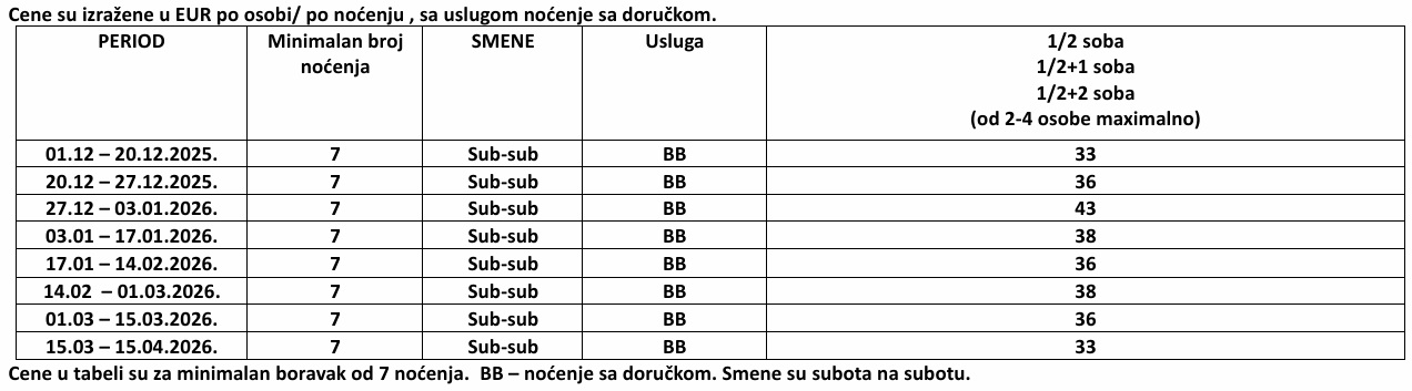 • Smeštaj na bazi usluge NOĆENJE SA DORUČKOM po osobi / po noćenju, za min 7 noći boravka, smene subotom;(manje od 7 noći boravka, hotel zadržava pravo izmene cene, isključivo na upit)