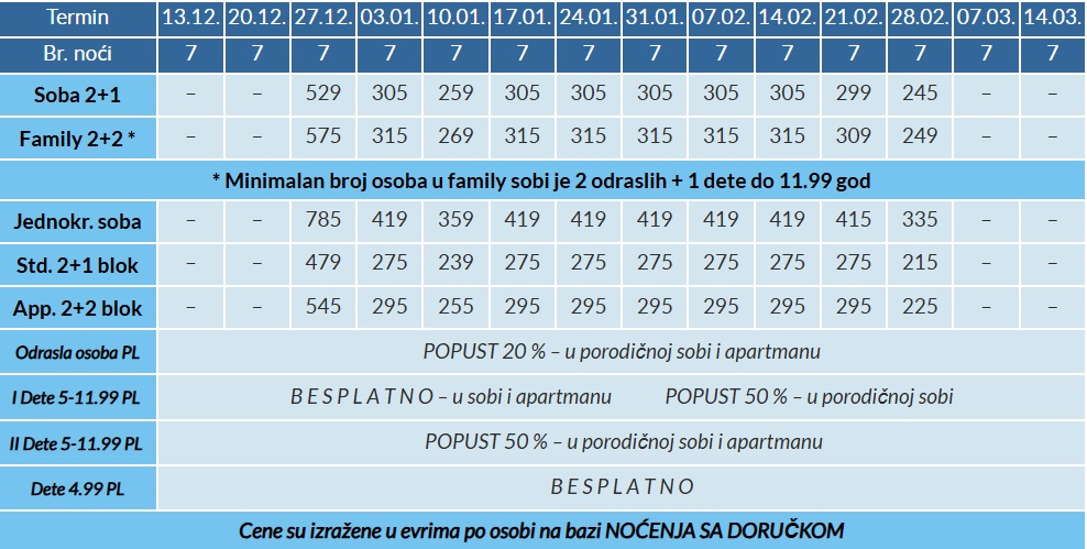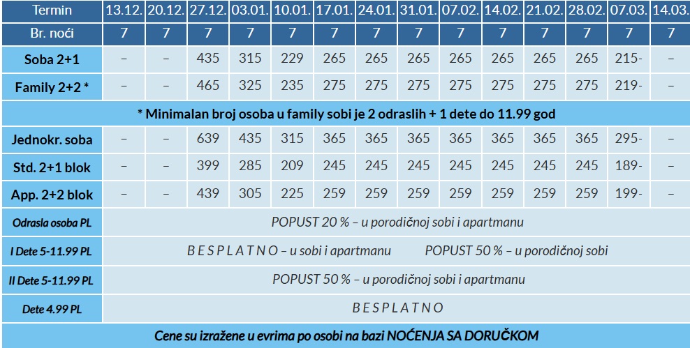 POLAZAK IZ BEOGRADA (NIŠA, NOVOG SADA) – je dan ranije u odnosu na datume iz tabele cenovnika smeštaja.