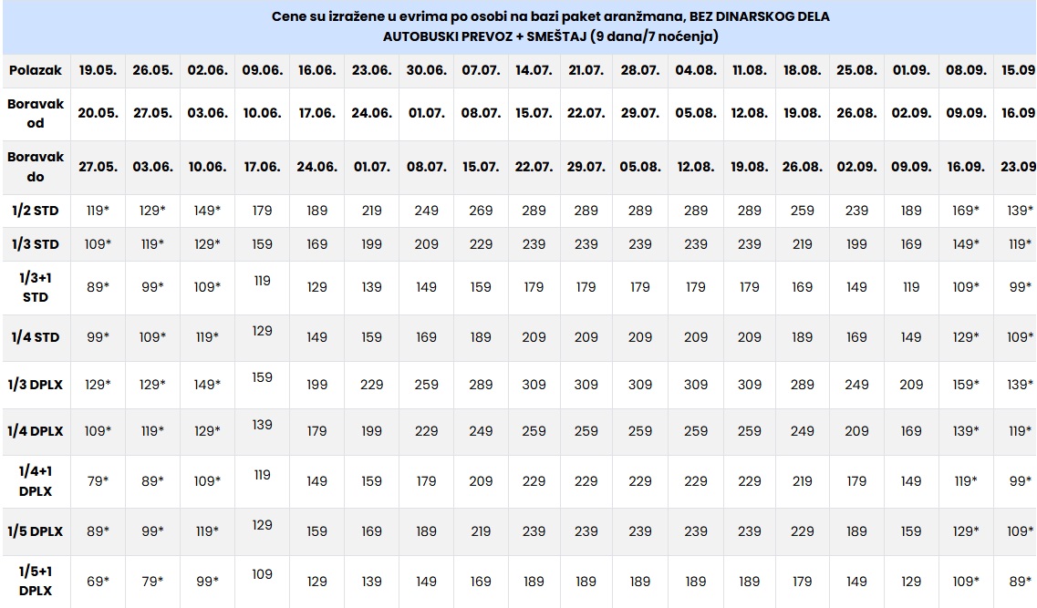 CENE SU IZRAŽENE PO OSOBI NA BAZI PAKET ARANŽMANA (smeštaj i prevoz) ZA POLASKE IZ BEOGRADA, NOVOG SADA I DUŽ AUTO PUTA.