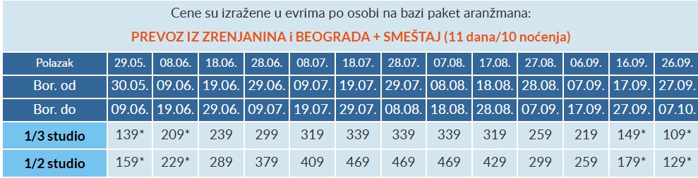 cena aranžmana se umanjuje za 40 € po osobi, osim za predsezonu i postsezonu (smene označene *) gde se u slučaju korišćenja sopstvenog prevoza cena umanjuje 30 € po osobi.