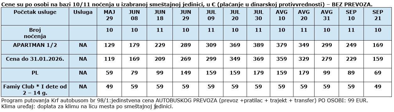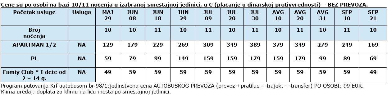 1.dan – Beograd – sastanak putnika pola sata ranije u odnosu na predviđeno vreme, dan ranije u odnosu na datum iz tabele. Predviđeno vreme polazak autobusa u 13:00h, iz Beograda. Obavezno dva dana pre putovanja proveriti u agenciji tačno mesto i vreme polaska autobusa. Dnevna i noćna vožnja sa usputnim zadržavanjima radi odmora. 2. dan -10. dan – …dolazak u Igumenicu I ukrcavanje na trajekt za Krf, smeštaj, boravak u izabranom objektu na bazi najma studija/apartmana. 12. dan – napuštanje objekta, polazak autobusa u vreme dobijeno od strane našeg predstavnika. Dnevna I noćna vožnja sa usputnim zadržavanjima radi odmora. 13. dan – dolazak u Beograd na mesto polaska. Kraj usluga.