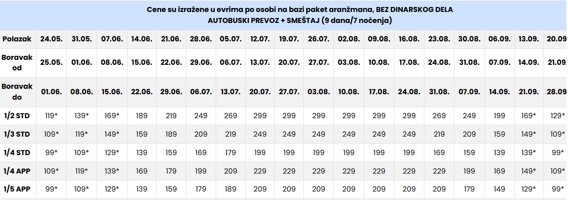 cena aranžmana se umanjuje za 30€ po osobi, osim za predsezonu i postsezonu (smene označene *) gde se u slučaju korišćenja sopstvenog prevoza plaća puna cena paket aranžmana.