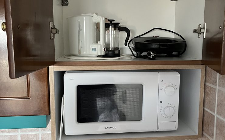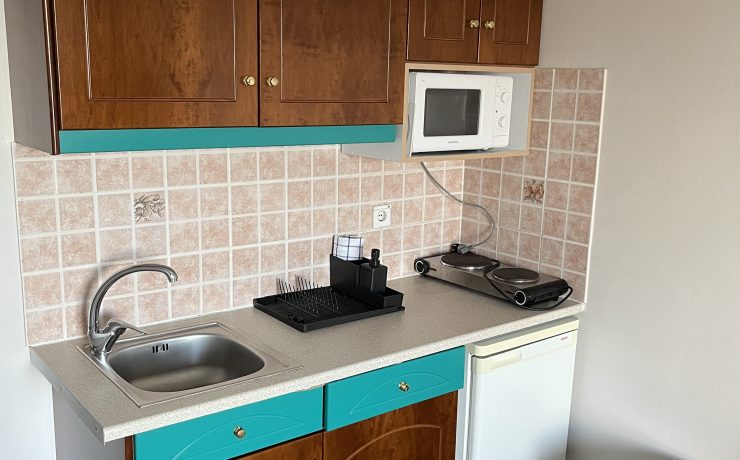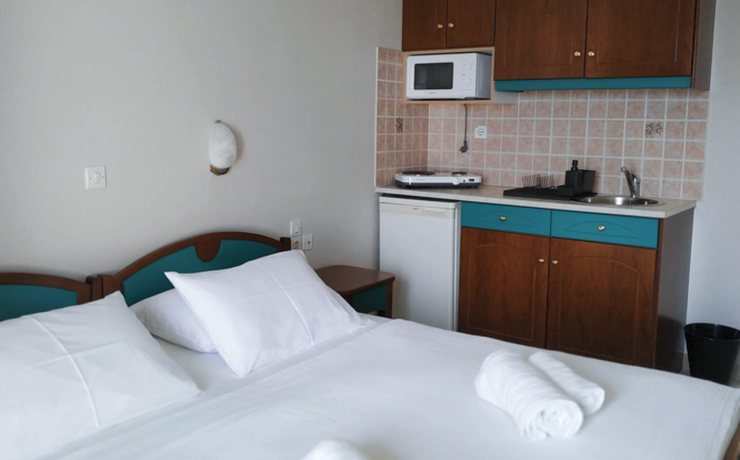 Studiji poseduju potpuno opremljenu kuhinju: fižider, mikrotalasna pećnica, posudje i čaše za dve osobe, toster, električni cajnik. Novo kupatilo sa tušem, sef koji se nalazi u ormaru i fen za kosu. Svi studiji poseduju sopstvenu terasu opremljenu sa setom stolica i kafe stolom. Balkonska vrata imaju ugradjen komarnik. U vili nudimo 1/2 studije za dve osobe i 1/3 studio za tri osobe. Studiji poseduju TV i klima uredjaje (uz doplatu 8e/dan) i Wi-Fi. Posteljina se menja na svakih pet dana. Po ulasku u studio gosti dobijaju set peškira, veliki i mali peškir po osobi (dva velika i dva mala peškira). Čistoću studija održava sam korisnik. Vila je opremljena novim nameštajem i naša je preporuka za ugodan odmor.