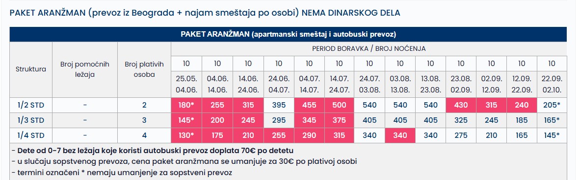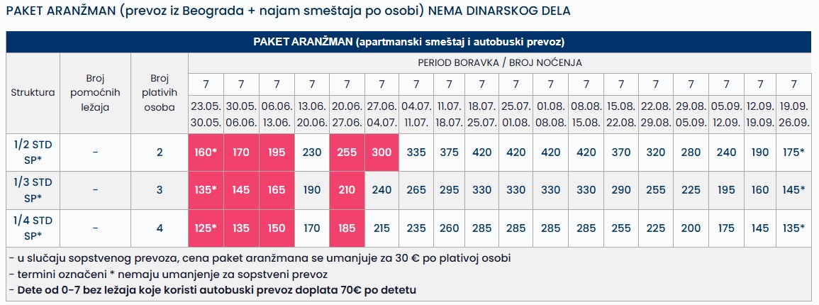 •Datum iz tabele se odnosi na period boravka. Polazak  autobusa je dan ranije u odnosu na datum iz tabele.
