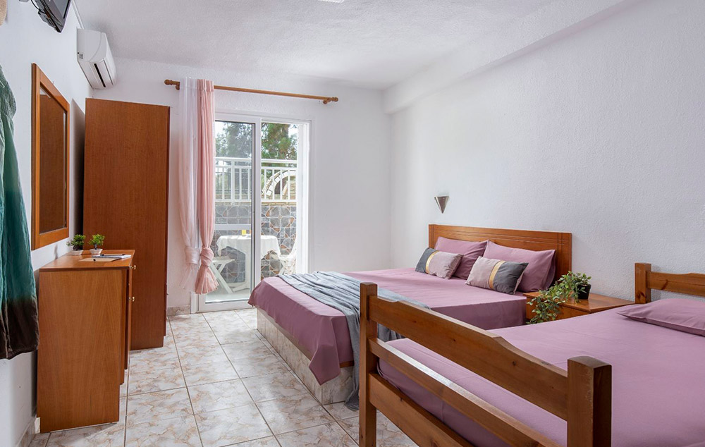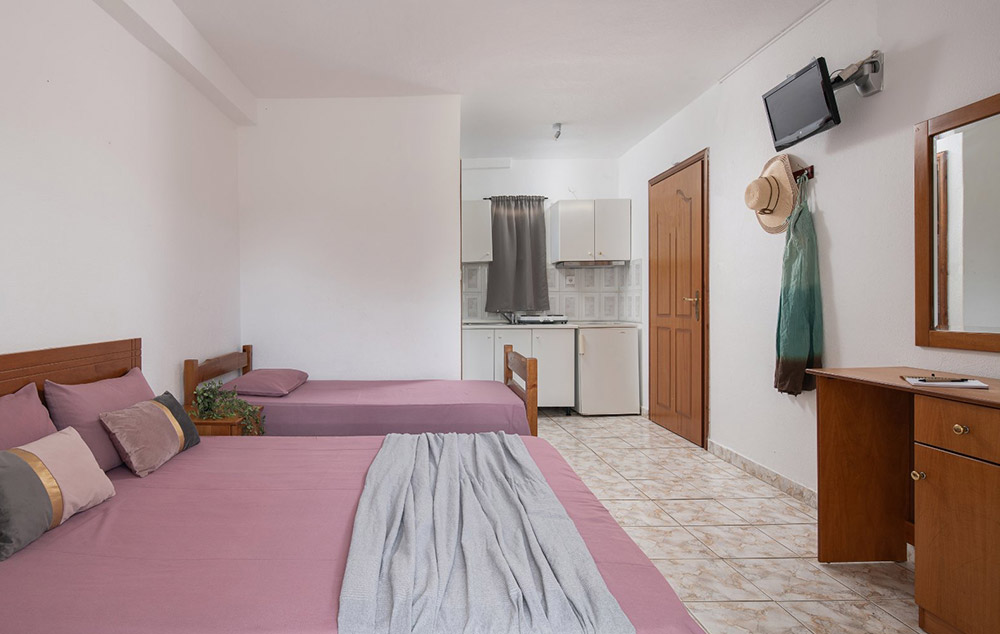 Opis: Vila raspolaže sa dvokrevetnim,trokrevetnim i četvorokrevetnim studijima koji se nalaze u spuštenom prizemlju, na prvom ili drugom spratu vile. Svaki ima opremljeni kuhinjski deo, kupatilo, terasu, TV, WiFi internet i klima uređaj (uz doplatu na licu mesta od 6 dnevno).