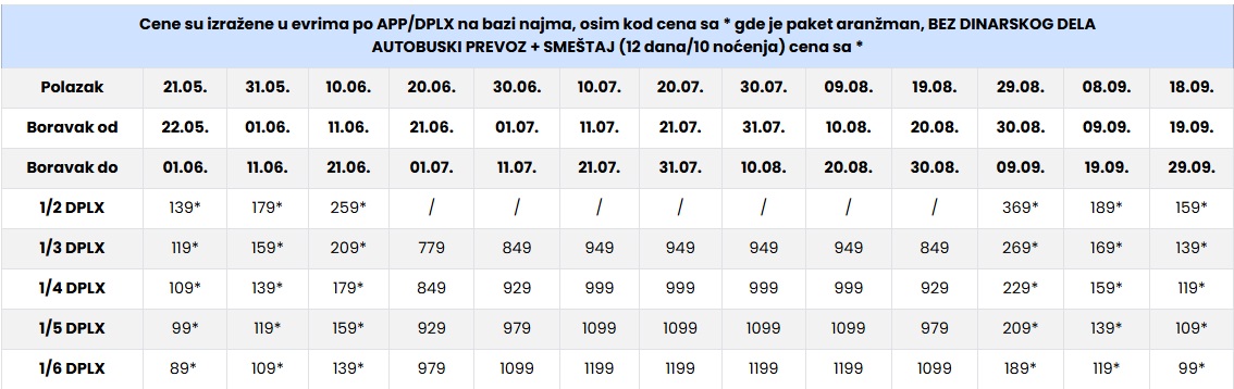 Smene od 21.06. do 30.08.2026. su po APP/DPLX – 10 noćenja