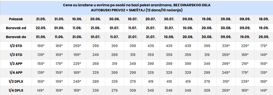 CENE SU IZRAŽENE PO OSOBI NA BAZI PAKET ARANŽMANA (smeštaj i prevoz) ZA POLASKE IZ BEOGRADA, NOVOG SADA I DUŽ AUTO PUTA.