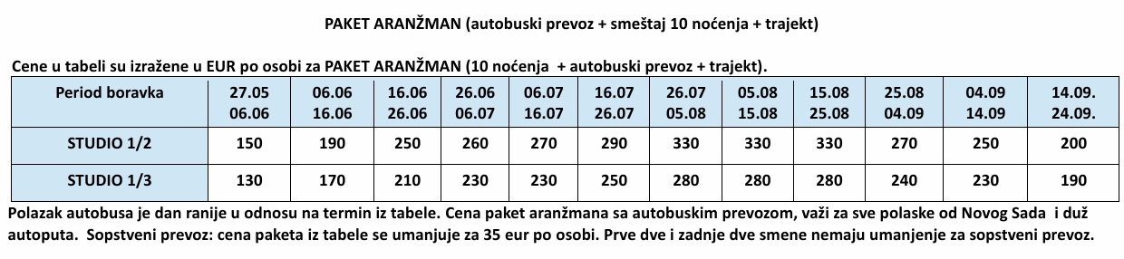 Cena apartmana/studija/mezoneta naplaćuje se po ležaju tj. sedištu u autobusu. Veličina smeštajne jedinice označava i minimalan broj paket aranžmana koji se naplaćuju,