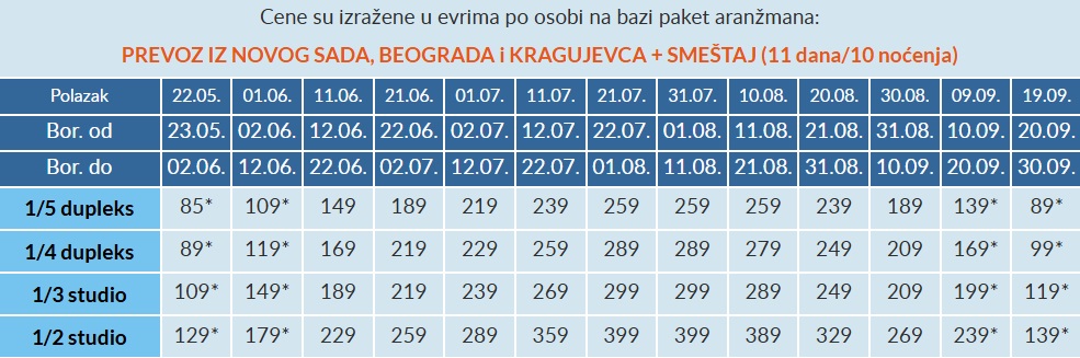 U slučaju spajanja smena na organizovanom prevozu, cena aranžmana za drugu smenu se umanjuje za 35 eur po osobi, osim za smene koje su u tabeli označene zvezdicom (*) gde se u slučaju spajanja smena cena umanjuje 25 € po osobi.