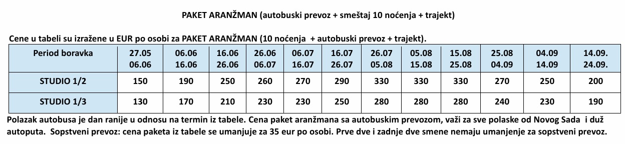 Cena apartmana/studija/mezoneta naplaćuje se po ležaju tj. sedištu u autobusu. Veličina smeštajne jedinice označava i minimalan broj paket aranžmana koji se naplaćuju,